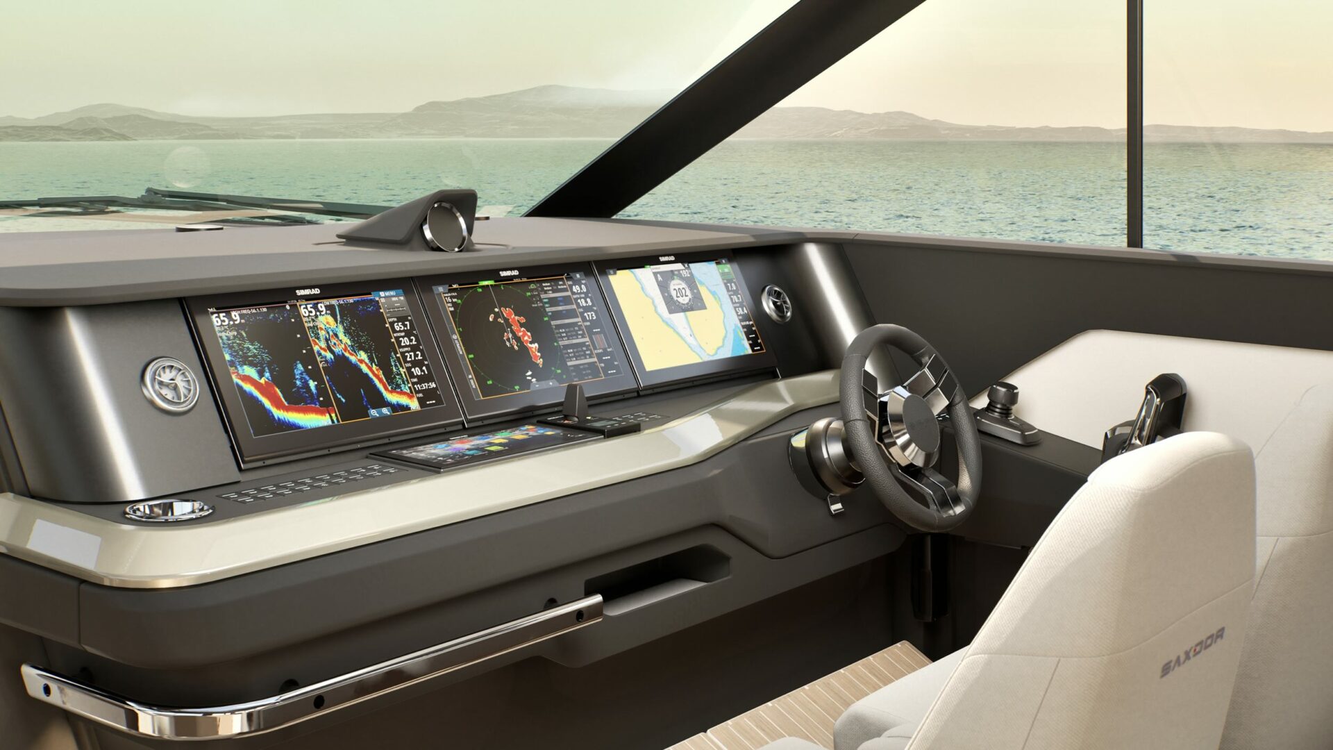 A sculpted, low-profile dashboard configured with up to three 16" Simrad displays. Surfaces stay clean and uncluttered, with essential controls placed exactly where your hands expect them, keeping your focus forward.